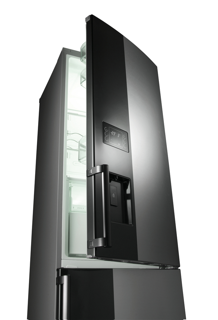 The two-colour front panel of this fridge-freezer plays with the design principle of symmetry. While the mat stainless steel surface has a refined and pure look, the black panel provides a striking colour accent. In the lower half of the upper panel all essential control elements were integrated discreetly and are easily accessible. In addition, the generous free-standing appliance creates a slim overall impression thanks to the black panel. The two metre high multi-function appliance accommodates an environment-friendly cooling technology, which is also quiet, reliable and effective. With 385 litres, the refrigerator compartment offers plenty of storage space for various food products. There are different temperature zones available. When acquiring the appliance, the customer receives an environmental certificate which confirms, among other things, that the appliance is reusable after its service life. Consisting entirely of recycled materials, the packaging follows an eco-political claim.