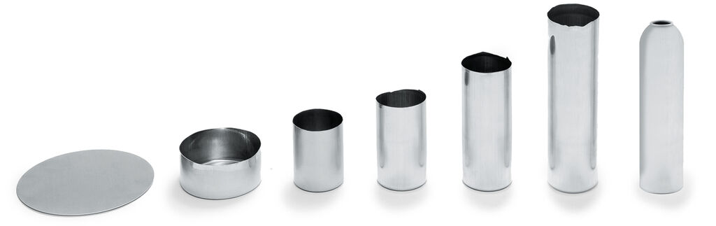 Icon V-Drive is a vertically mounted forming station with an air-guided forming punch. It produces aerosol cans from previously unusable recycled aluminium. Since the cans are directly manufactured from disk blanks, it dispenses with machines for blanking, drawing, ironing and also scrap logistics. Moreover, it is possible to produce cans with thinner walls, which amounts to a savings in material of 40 per cent. The station features glass and aluminium profiles with curved cover panels and a stylish colour concept, which communicates innovation, quality and safety.