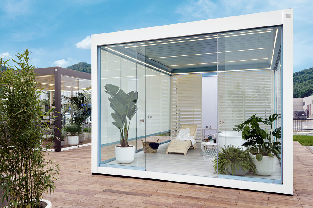 Imago is a high-quality pergola system whose modules can be combined to form a protected space outdoors. Following new room concepts, the system includes load-bearing structural components, adjustable blades and various side walls. The stable construction provides high comfort for staying outdoors, regardless of the weather. Floor-to-ceiling sliding glass doors are possible and can be opened and closed smoothly with the help of running rails.