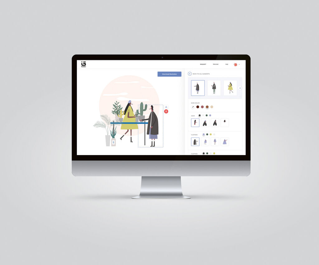 ITG.digital is an online builder of illustrations, as used for websites, apps, social media posts or presentations to communicate ideas visually. It was developed with the objective of providing people with a tool to easily find and customise illustrations according to individual needs, without any special software or knowledge. ITG.digital serves as a platform that allows one to automatically create custom illustrations from predefined elements, which are available in high resolution and vector graphics (JPG, PNG, SVG). Users can edit the elements and apply specific brand colours as required.