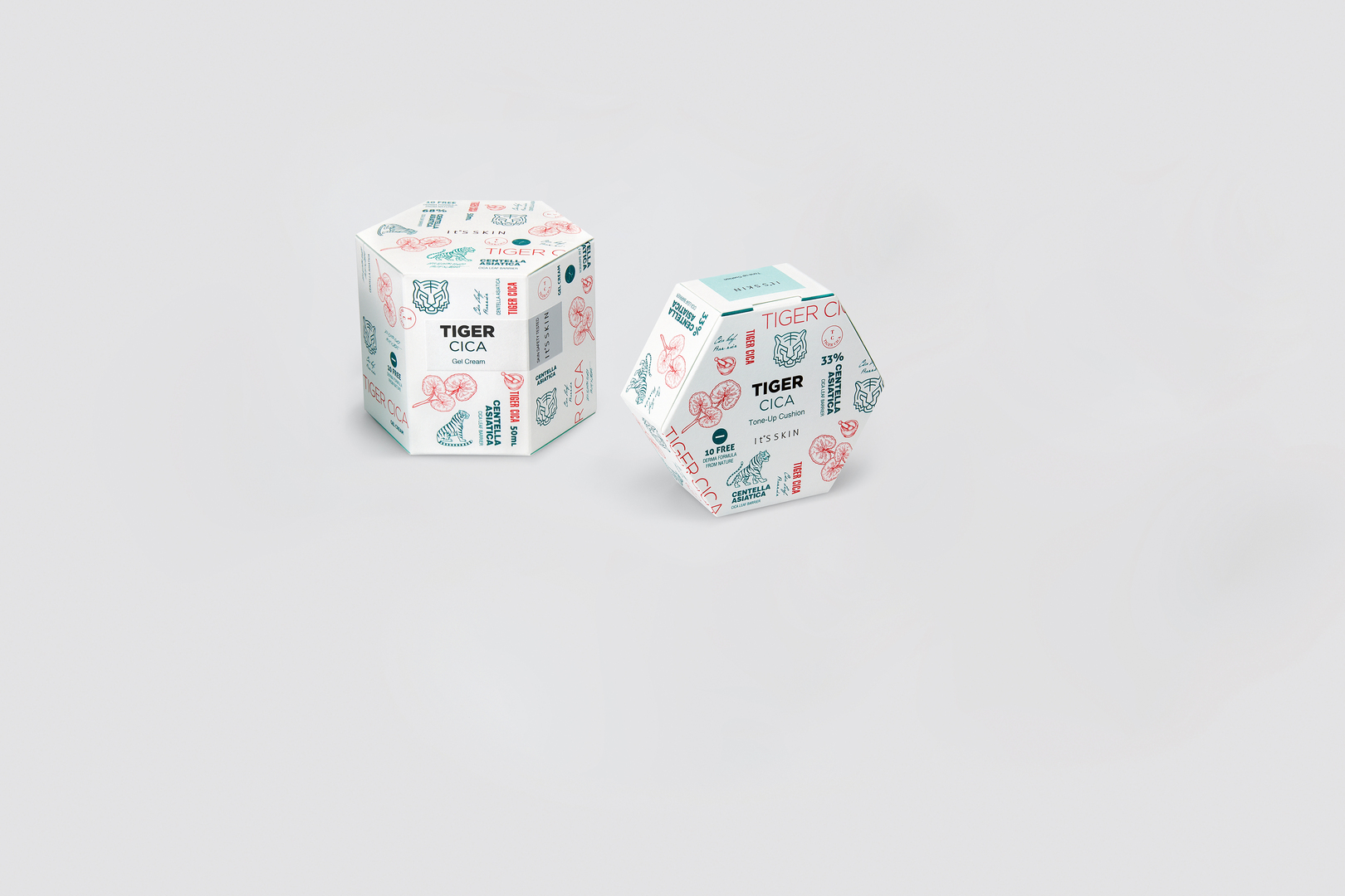 Tiger Cica is a line of skincare and make-up products containing Centella asiatica extract, which is known as “tiger herb” in India. To reflect the special characteristics of the product, the packaging design expresses a pure, clean image and therefore uses pastel-toned colours with low intensity and saturation. The concept chose vivid red and green patterns to support and further enhance the story of tigers and the main ingredient. To convey the powerful effects of the product, the cap features the engraving of a tiger icon.