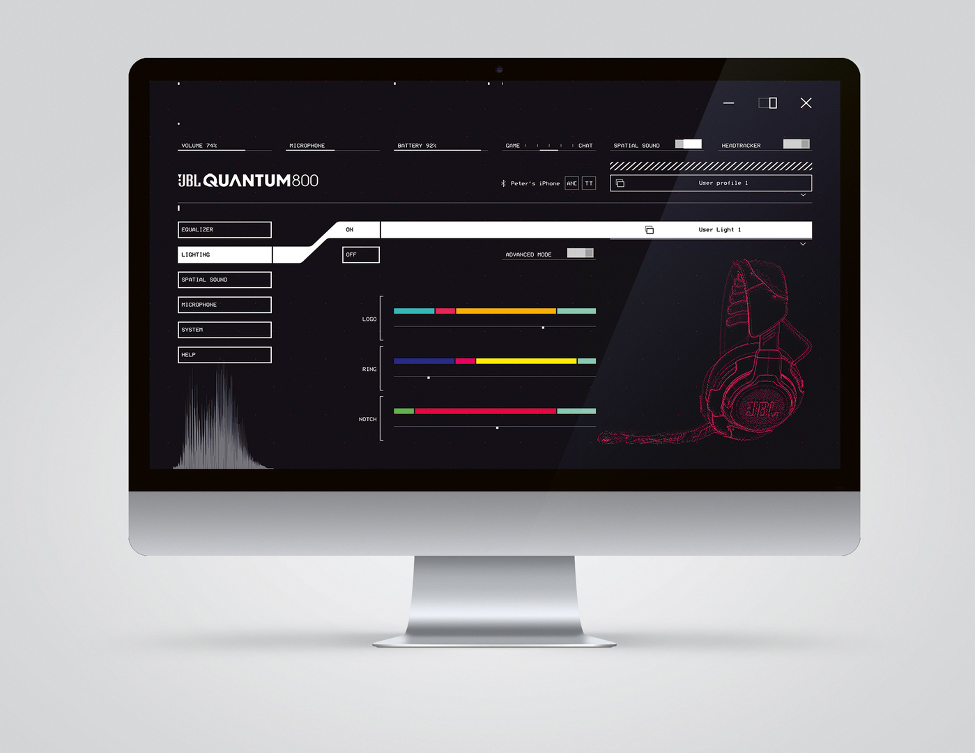 JBL QuantumENGINE is a PC-based app for a new series of JBL Quantum headphones. Designed for gamers, it combines audio controls, multichannel surround sound, multi-zone RGB illumination, 3D audio virtualisation and 3D head-tracking, thus delivering a perfect gaming audio solution. The app also allows users to personalise the JBL Quantum Headphones with 16 million colours, speed, light effects and custom colour shifts. Featuring a “Quantum speculative scenario”, the user interface is projecting a dystopian world where advanced technology exists but is available only to a specific set of the population.