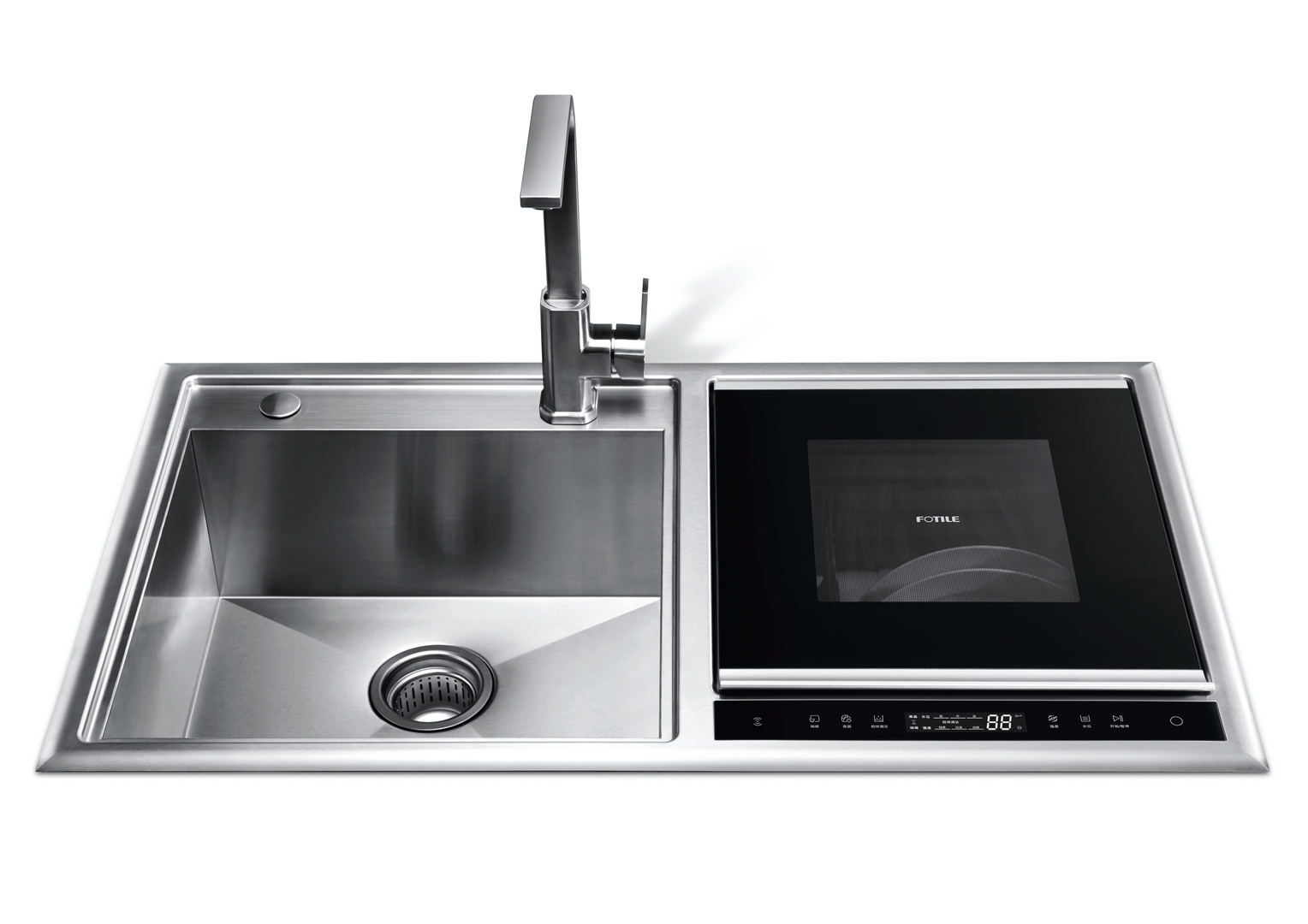 This product combines a sink with a dishwasher and an ultrasound cleaner for fruit and vegetables. The space-saving combination appliance displays a minimalist and at the same time functional design. The environmentally friendly dishwasher with “Hand Washing Simulation++” technology requires only 28 minutes and six litres of water for a washing cycle. With its “High-frequency Ultrasound + Turbulence” technology, it removes over 90 per cent of chemical substances from fruit and vegetables.