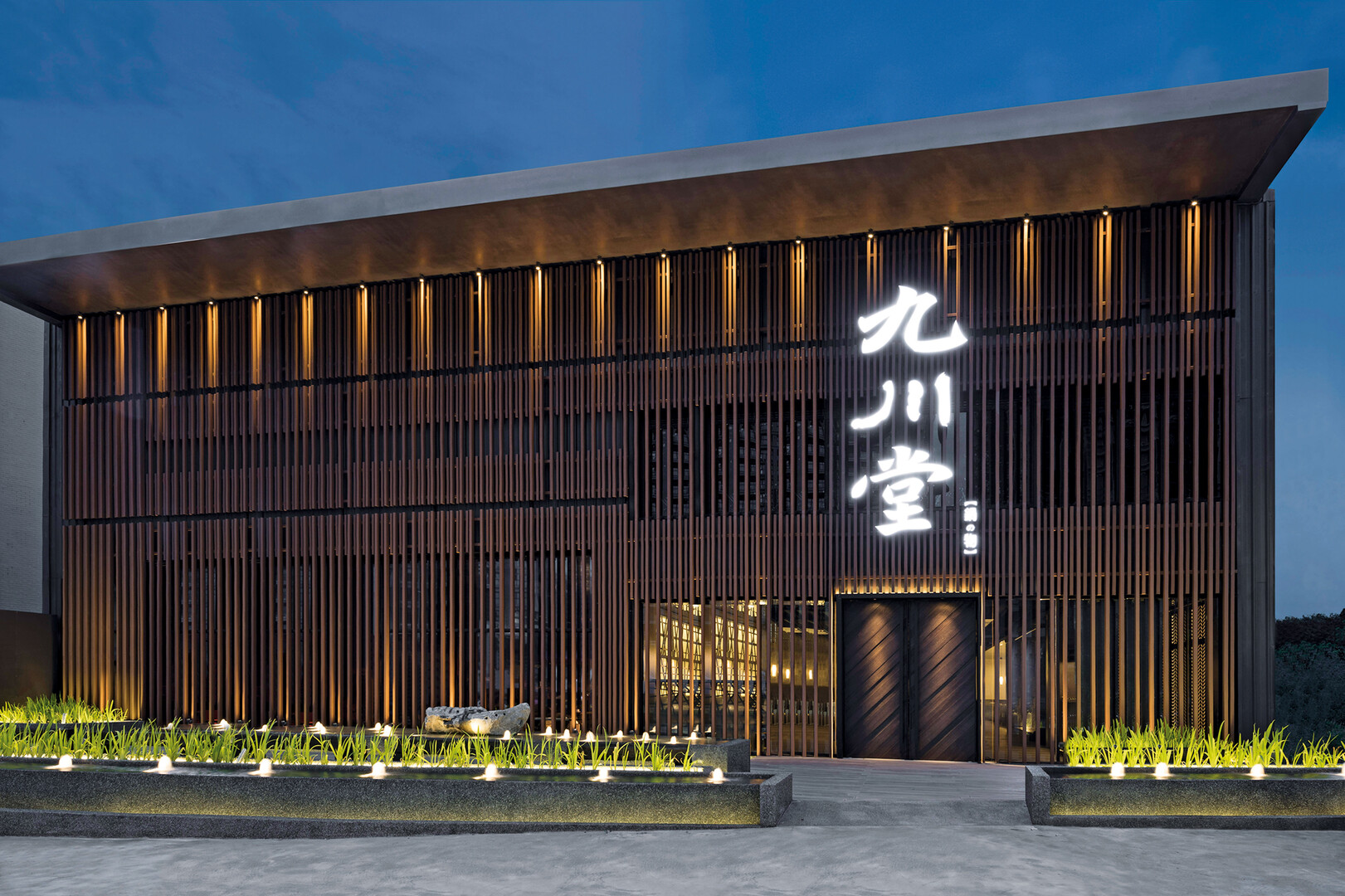 The design idiom of the Jiou-Chuan-Tang Hot Pot restaurant is modelled on the teachings of Zen in that it merges contrary elements into a unity. The exterior of the building is defined by an ironwood grating with different spacing and line dislocation expressing the beauty of imperfection. The first interior space features tables arranged around a stone basin highlighting a massive yet floating appearance. The second interior space impresses with a wooden ceiling that looks like a wave frozen in time and a vivid interplay of light and shade.