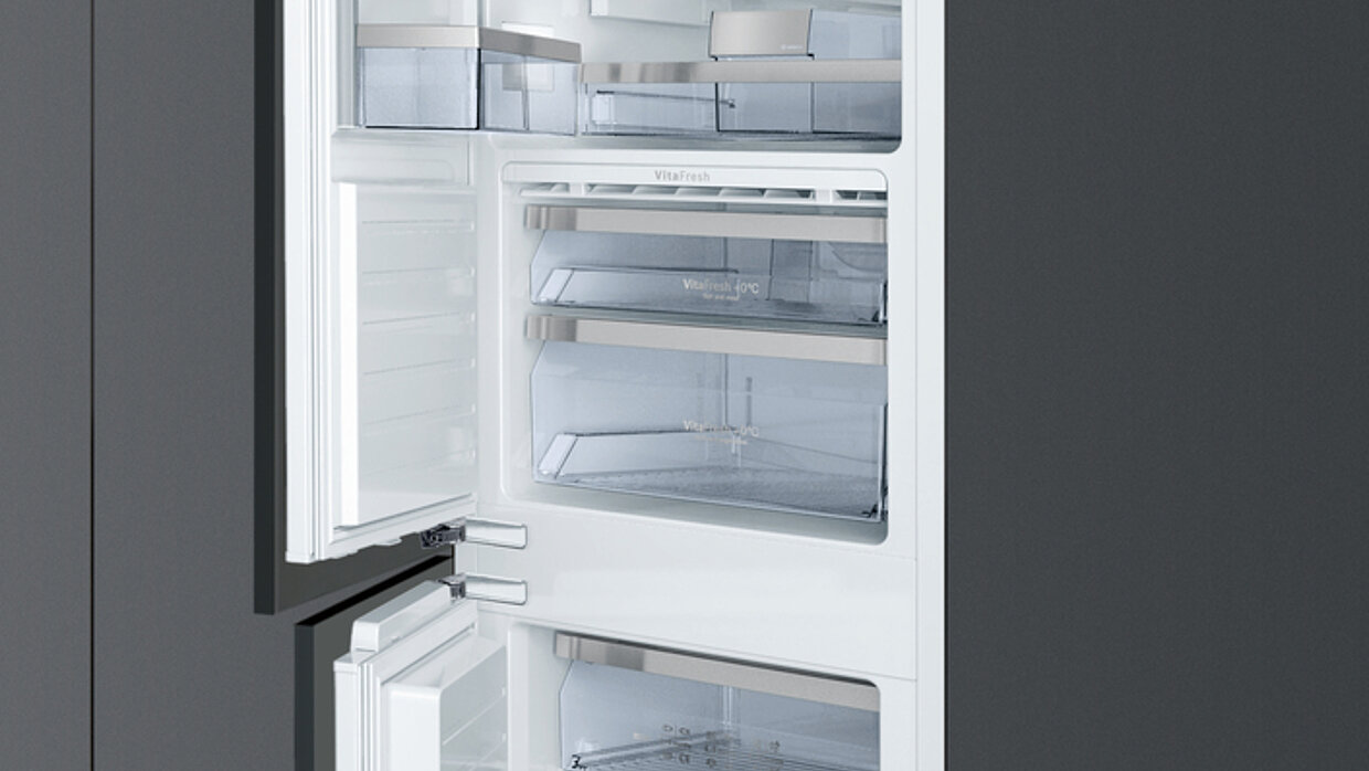 This innovative fridge-freezer series sets new standards in terms of design and technical equipment. The distinctive exterior look attracts attention because of the consistent use of authentic materials. Solid stainless steel doors support the good insulation properties of the appliance; achieving the energy efficiency level A+++, they account for very economical operation. Inside, high-gloss brushed metal applications combined with high-gloss, transparent plastic produce a visual perception of depth and value. The white lining on the sidewalls also creates a solid impression of the fridge and freezer compartment, the temperature of which is separately controlled by touch technology.