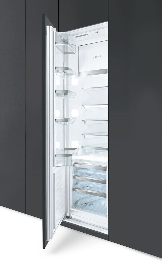 This built-in refrigerator is part of a generously sized equipment series with the energy efficiency rating A++. Due to a patented relocation, the cooling system was accommodated in the base of the appliance thus generating more volume. By means of glass panels and door shelves with an integrated EasyLift system, the interior can be used flexibly even when full. Smooth-running pull-out elements allow convenient access to refrigerated goods. In addition, innovative soft-close hinges complement the modular design concept.