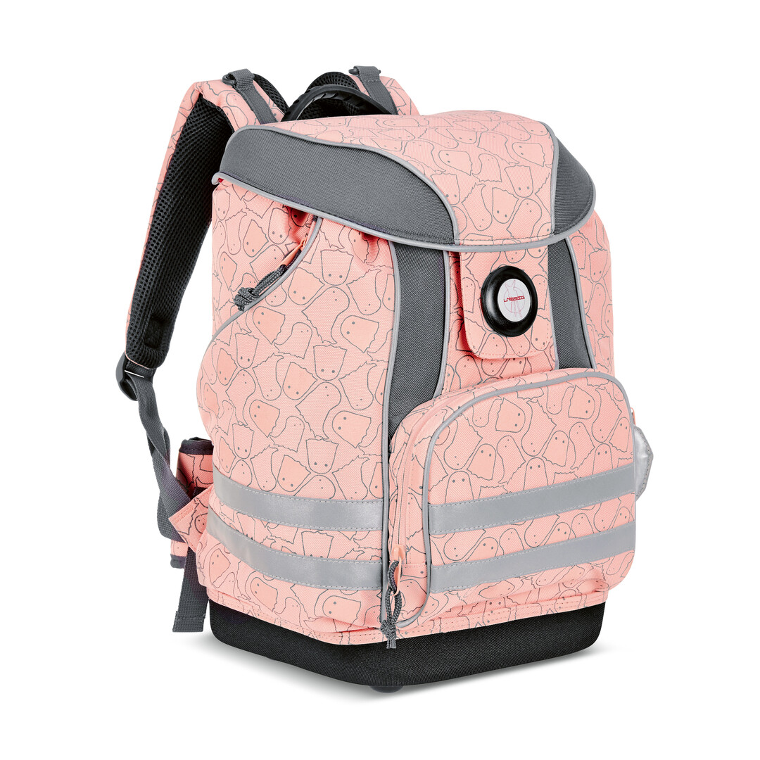 The particular feature of these school bags is the design. The pattern of stylised ghosts glows in the dark and is automatically recharged when exposed to light. Reflectors and reflecting surfaces provide safety, while an integrated, removable rain cover keeps it from getting wet. The back of the bag and the carrying straps are upholstered, allowing for a pleasant and back-saving carrying experience. The school bag can be easily opened and then closes automatically by means of a magnetic rotary fastener.