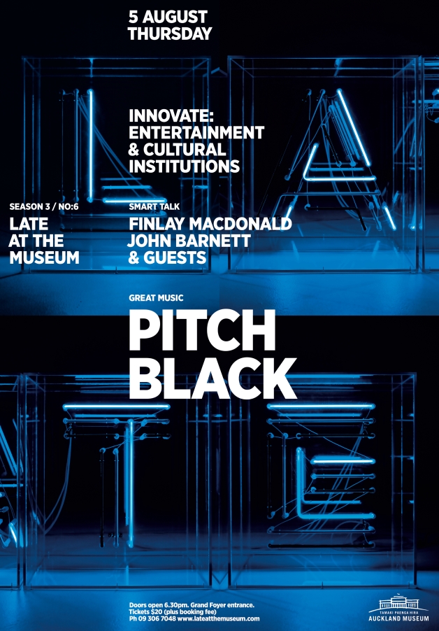 The Auckland Museum is a natural history and war memorial museum in the process of repositioning itself and improving their relationship with visitors. The posters serve to announce the monthly event LATE and highlight the fact that the museum is opened longer on this day. Neon lights were chosen as an appropriate visual metaphor to illustrate that point. Each letter, made from fluorescent tubes, is aligned with the typography of the AM campaign (AM is an acronym for Auckland Museum) and positioned in a perspex cube. Thus, the letters could be set up in different configurations.