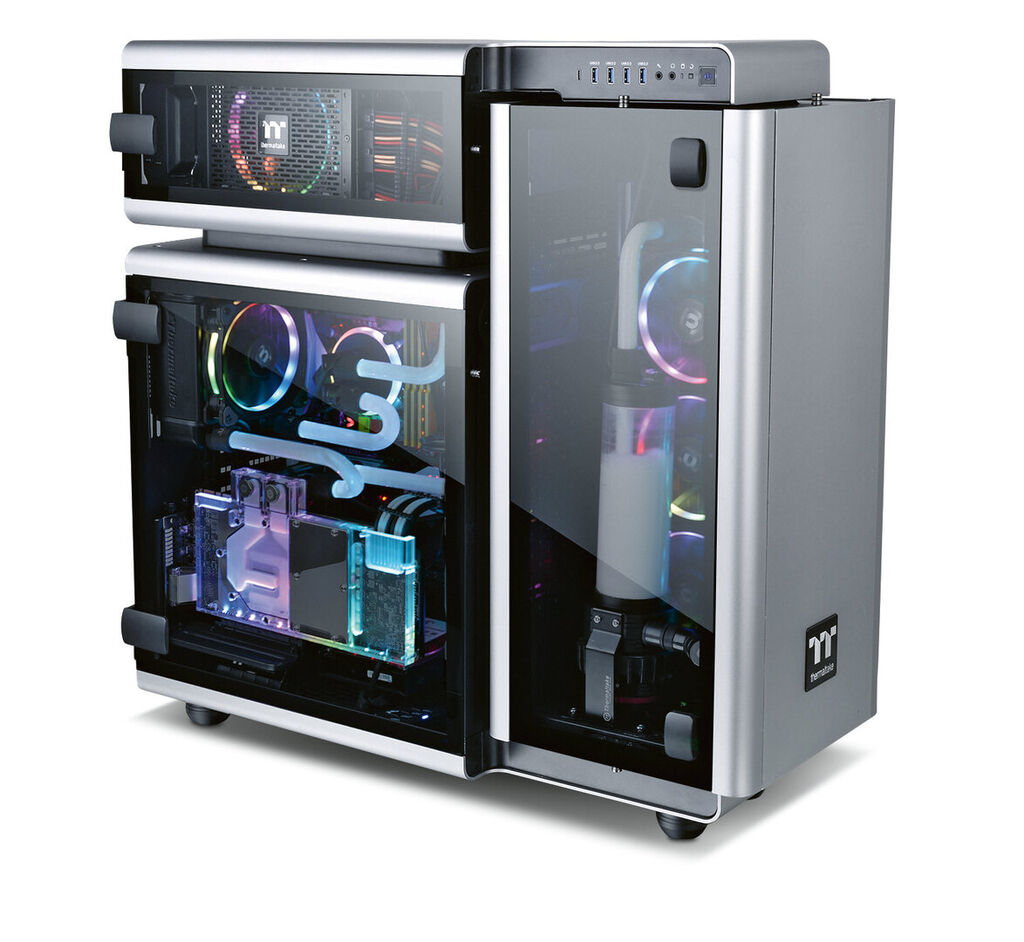 The aluminium computer chassis features a game-oriented design with architectural aesthetics. Its trio chamber structure ensures optimum ventilation and best-possible utilisation of available space. The hinged swing doors are equipped with 4 mm thick tempered glass windows, enabling a clear view of the interior. A USB 3.1 Type-C port provides high data transmission speed, while three built-in Riing Plus 14 RGB fans ensure efficient cooling.