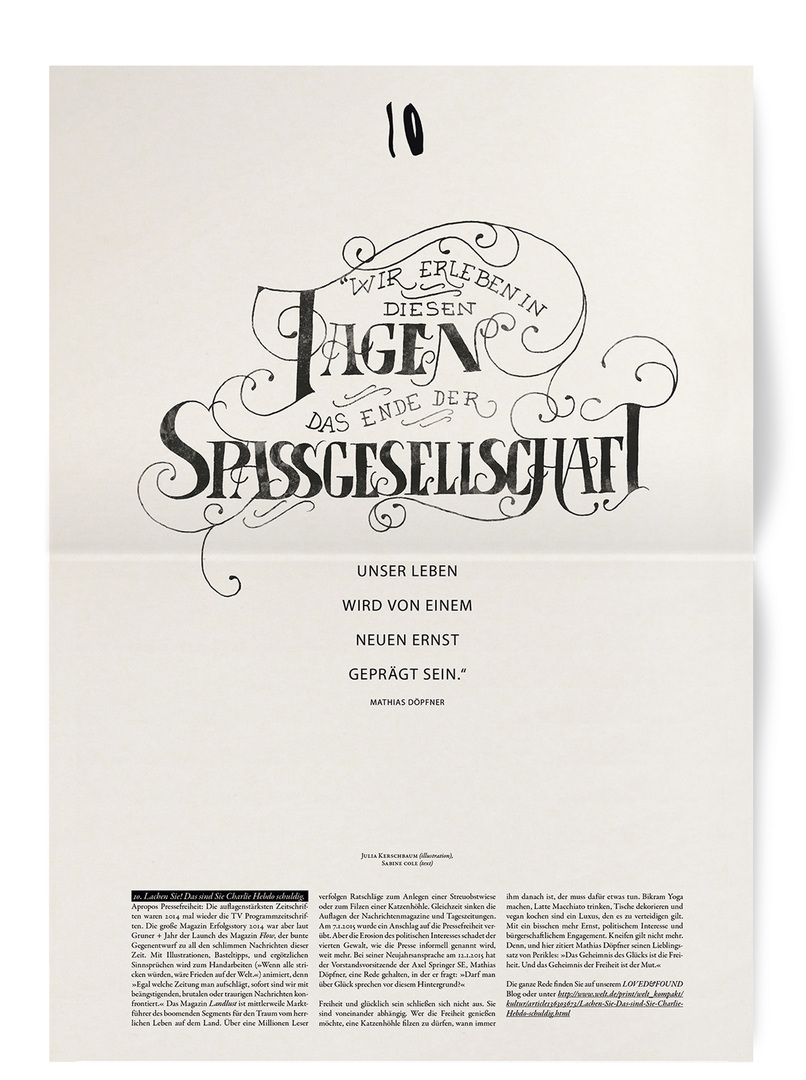 After the terror attacks in Paris, this special issue of LOVED&FOUND magazine made a statement in favour of humanity and peaceful cooperation. This issue of the magazine, which normally curates “things that we love” and turns them into stories, featured multifaceted interpretations and responses to questions such as “What concrete contribution can each of us make to a society of mutual respect?” The special section “things that we can do” invited all employees, friends, authors and photographers to contribute; the editorial production was limited to ten days.