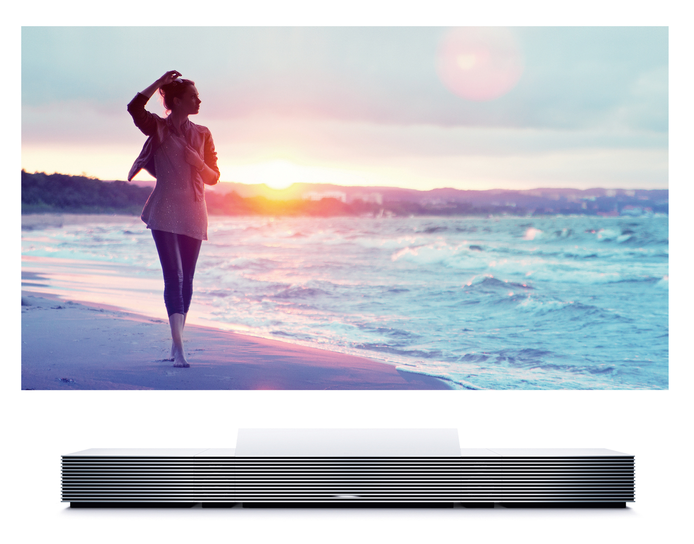 The 4K ultra short throw projector and the associated method of image projection reinterpret the way we watch TV in an exciting way. With its ultra short throw technology, it projects an up to 147” large image onto an ordinary wall. This high-resolution projector thus replaces conventional screens as viewing devices. It stands out with both a functional and aesthetically appealing design, which perfectly reflects its technical potential.