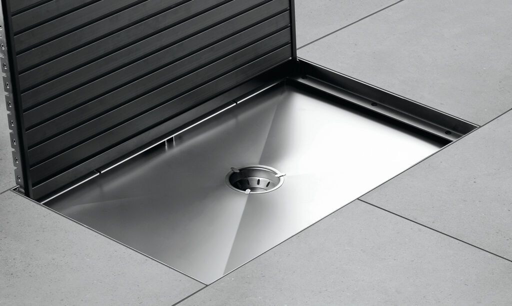 MatLine is an intelligent doormat system that is built into the entrance hallway or utility room and is connected to existing drainage systems so that excess water can drain away. It consists of a mat, a frame, a sand trap and a fitting. The mat has a slim, brushed stainless steel frame and is flush with the surrounding floor. Below the mat is a sand trap to collect dirt and grit. The fitting beneath is cast into the floor.