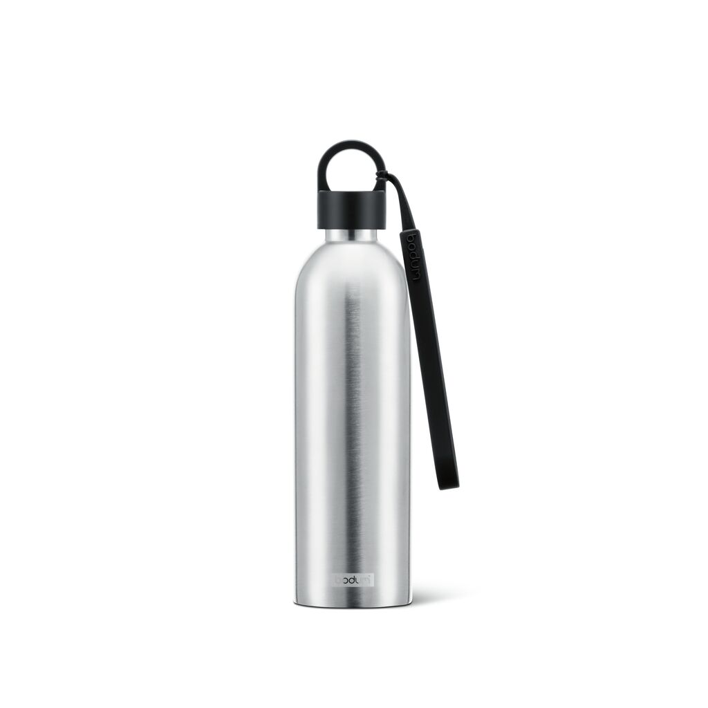 To ensure healthy hydration when on the go, this vacuum flask keeps drinks cold or hot for a long time. Thanks to its double wall, the outer surface remains safe and pleasant to touch as the temperature of the drinks is not transferred to the outside. The stainless steel bottle is available in a matt or high-gloss polished version. A leak-proof screw cap and the silicone strap make this dishwasher-safe drinking bottle with a capacity of 0.5 litres easy to carry.