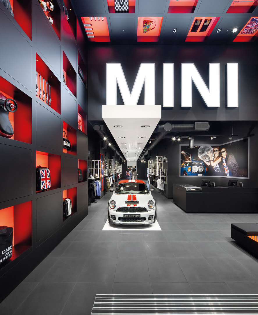 Here the design task involved realising a temporary MINI brand store located in Europe’s largest shopping mall in London, Westfield Stratford City, to be open for one year only. The store aims to give visitors the opportunity to browse the latest MINI models in a premium retail setting. It clearly differentiates the presentation from conventional car showroom environments and thus addresses a new target group. Realised within a period of only three months, the store showcases contemporary retail technology, including a touch-based interactive mirror that allows customers to virtually try on the outfits on sale. In addition, using a 3D car configurator, they can create their own MINI in 3D and request a test drive.