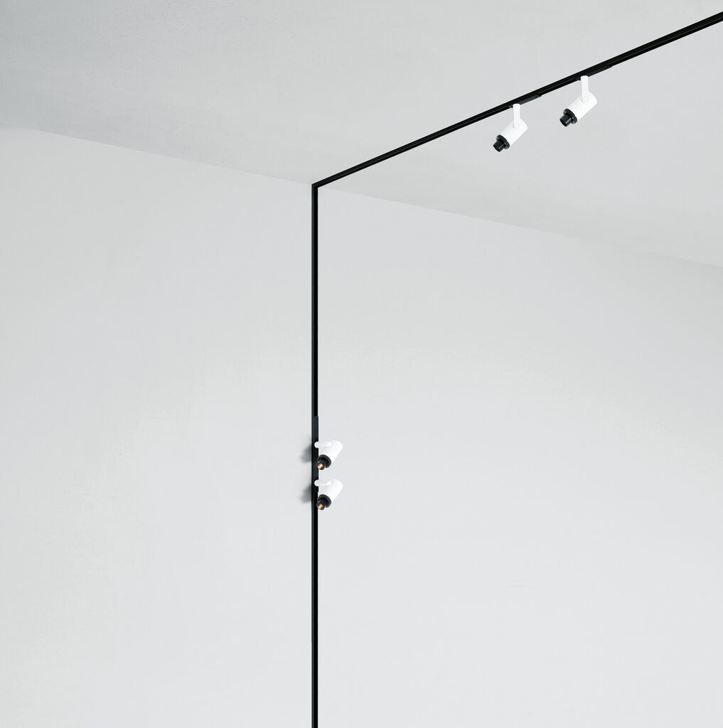 Minimal Track is a low voltage track system (24 volts) whose special feature is the miniaturisation of the profile, luminaires and components. Thanks to its subtle, minimalist design, the system appears simply as a delicate line on the wall and ceiling. Minimal Track is composed of a matte black anodised aluminium profile and a flexible conductor with a rectangular cross section, merging together into a visual unit. With a width of 15 mm and a height of 10 mm, the system is hardly noticeable as a design element.
