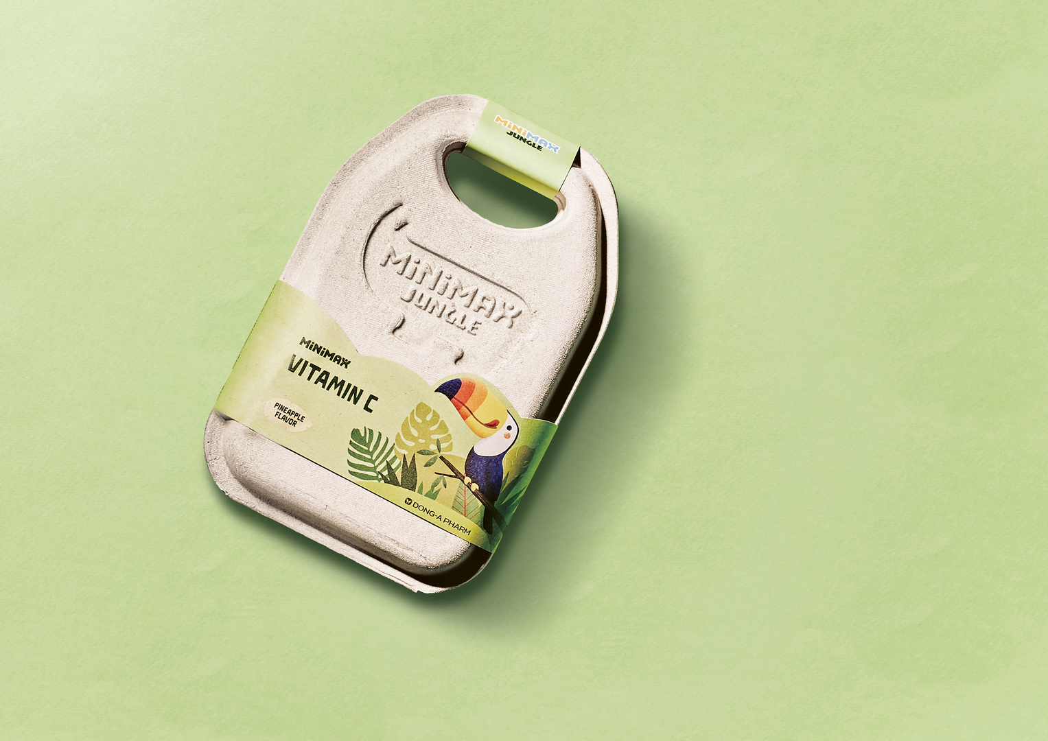 Minimax is a brand of nutritional supplements created for children. The products have the appearance of gummy bears and are packed in bags for portion control. In order to attract the child’s attention, the logo and packaging showcase cheerful jungle characters. Befitting the brand’s claim of sustainability, recycled paper fibre and eco-friendly paints have been used for the packaging. Its parts can easily be separated as recyclable waste. Moreover, the box encourages children to play, as it can be repurposed as a toy box or used as a canvas to paint on.