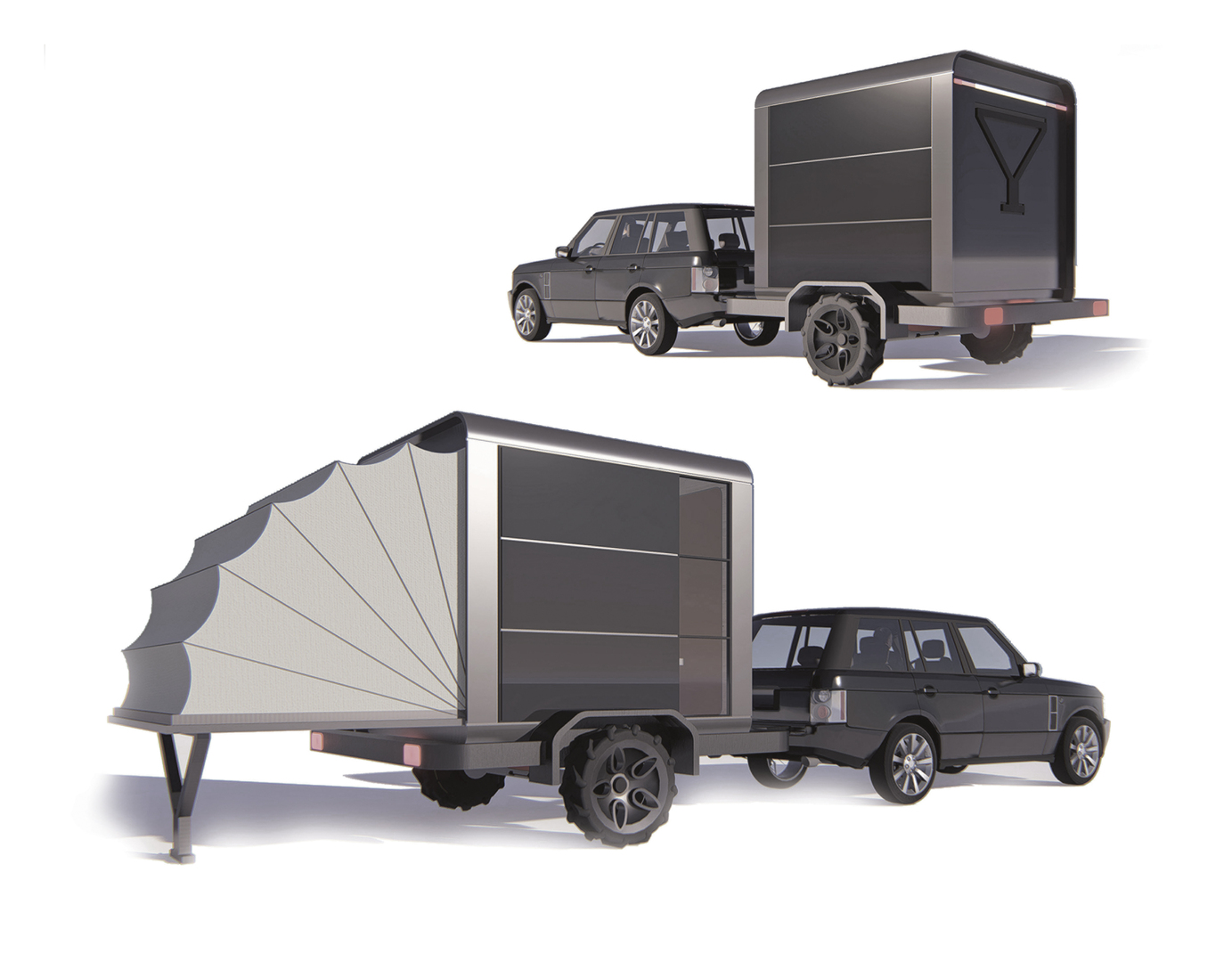The rear section of the cube is a telescopic tent that opens up and transforms into a bedroom space that is fixed by brackets. It provides a sleeping area for a maximum of two adults and two children. The structure is simple and the operation is convenient. The cube is also equipped with different living spaces and devices—a cooking bench, transformable desk, hand sink, water boiler, toilet, television, and an extended space.