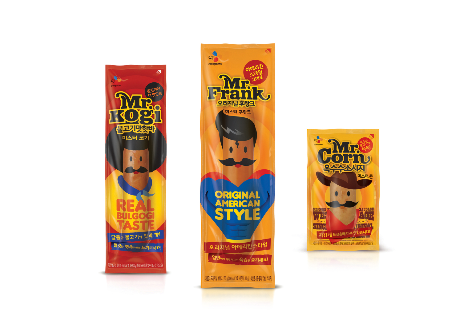 Mr. Corn, Mr. Frank and Mr. Kogi are sausage products with offbeat personalities. A series of different characters were designed, one for each flavour, to amuse trend-conscious consumers. The characters differ in terms of outfit and hair, reflecting each sausage recipe’s country of origin. By incorporating transparent window areas of shrink film into the packaging design, round shapes of ham and sausage (the actual product) serve as body parts of the graphic characters, adding even more life to them.