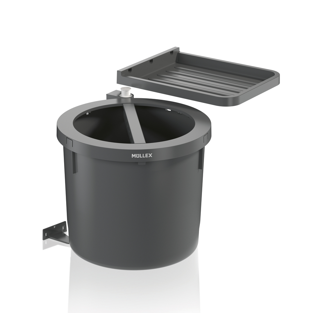 The Müllex D-LINE waste system is characterised by its simple installation in kitchen base units. Its smooth-running bayonet guide allows the waste bin to be guided gently, while an additional storage compartment provides space for bin liners or cleaning utensils. The insertable separator makes it easy to separate waste into up to four different bags. The matt, anthracite-coloured surface with pearl white accents ensures a high-quality and timeless appearance.