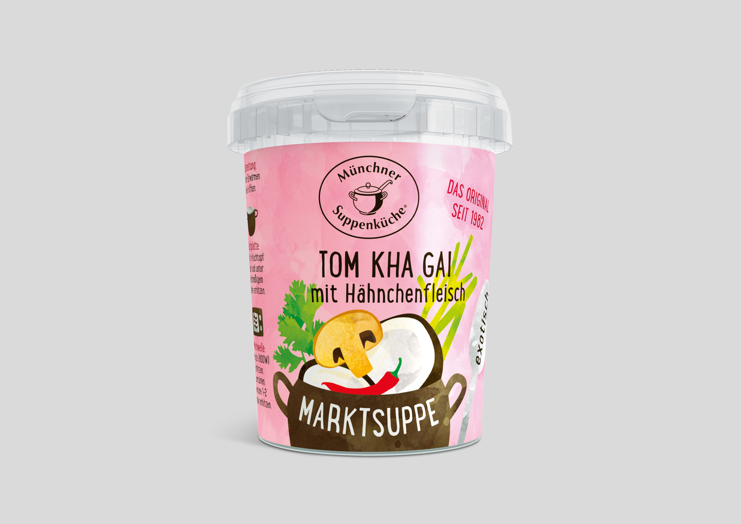 This soup brand from Munich was established in 1982 and has its own market stall at the famous Viktualienmarkt farmers’ market in Munich. For the relaunch of their soup range, which is available in supermarkets, the packaging design highlights the benefits of the product and communicates freshness, handmade pure quality and also Bavarian tradition. In order to tell this story on a sealed cup of soup, the product is named “Marktsuppe” (farmers’ market soup). Hand-sketched drawings of vegetables and other design elements attract consumers thanks to their colourful market feel, while a matching handwriting type underscores the natural ingredients.