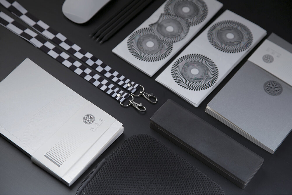The 24 layers in the logo represent the hours of the day. 24 is a factor of 360 and is used to create the different layers of the logo. There are 360 black and white boxes in each layer. This symbolism around the number 360 governs both the design of the logo and the museum’s merchandise.