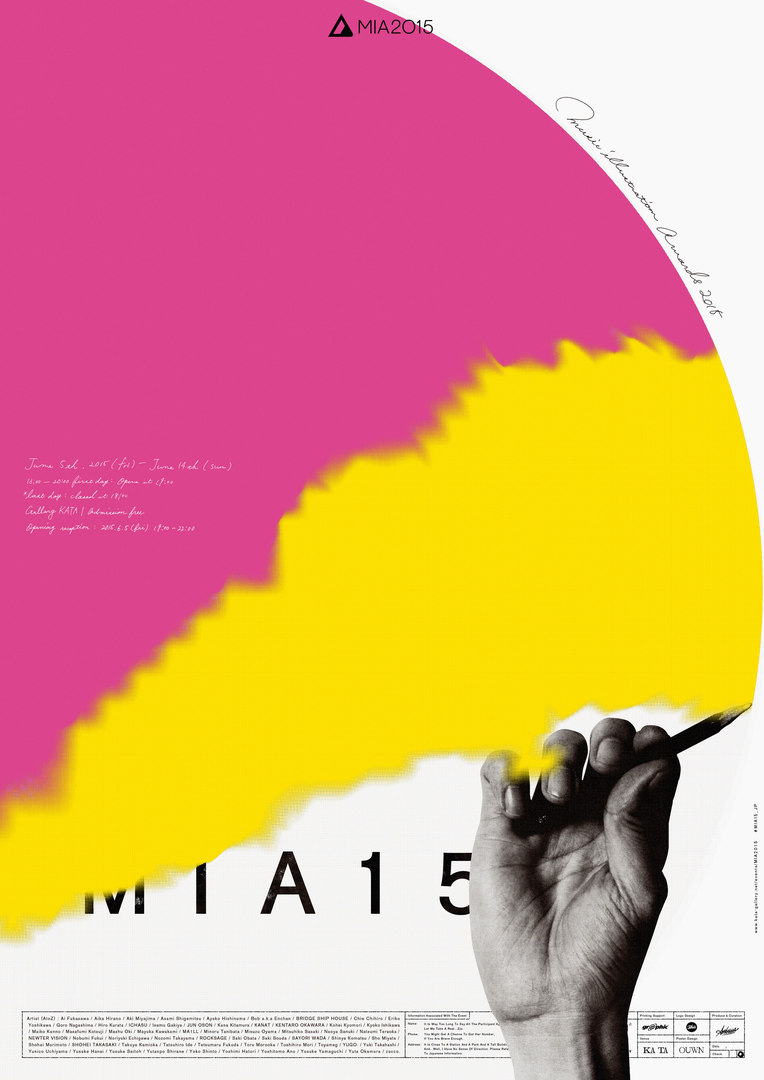 The Japanese Music Illustration Awards 2015 presented new works by 59 artists who had created illustrations for record sleeves. The exhibition posters smoothly incorporate aspects of different works by integrating abstract, figurative and typographic elements. Within the imagery, a drawing hand in black and white serves as a distinctive motif. Subtle superimpositions of radiant colours give the posters a mysterious touch and increase awareness for their message.