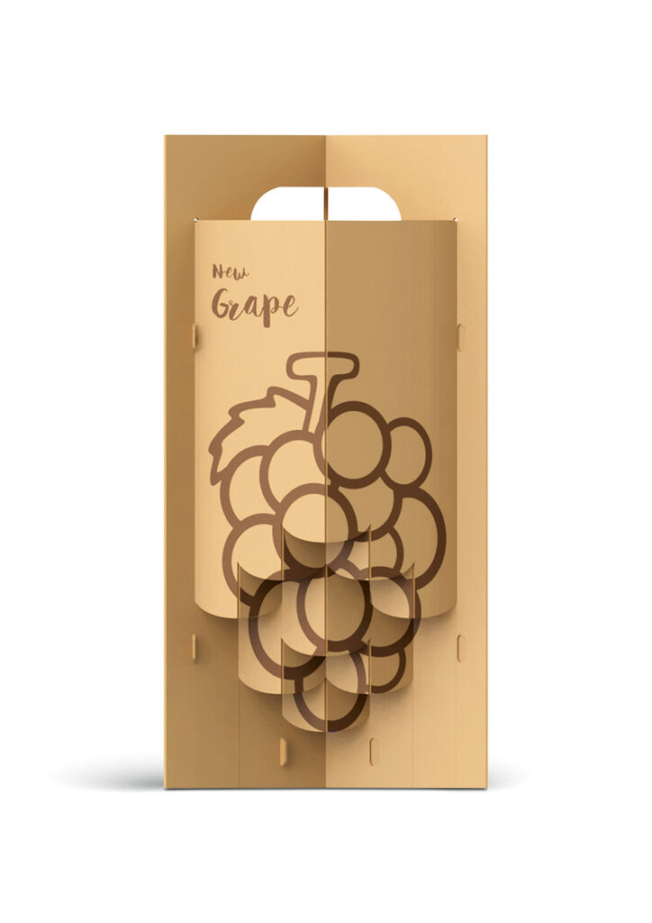 New Grape Packaging is based on a design concept that is both minimalist and sustainable. Following an environmentally friendly philosophy, the package is made from recyclable corrugated cardboard. By simply folding and slotting in place, the piece of cardboard is transformed into a three-dimensional container, which can be used to transport grapes and for retail. The hexagonal design is space-saving and prevents the grapes from being handled and bruised. Instead, they are protected and held in place, while the air circulates freely through the package.