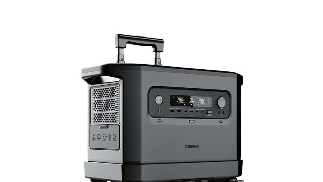 The Nexode 3 in 1 fast charging power bank combines both charger and power bank functionalities in a compact housing with rounded corners and smooth, curved surfaces. With an integrated AC plug and included USB-C cable, it connects directly to power sockets, eliminating the need for separate accessories. The textured cable also serves as a practical lanyard. The arrangement of the display and buttons in a square on the front ensures a clear control layout.