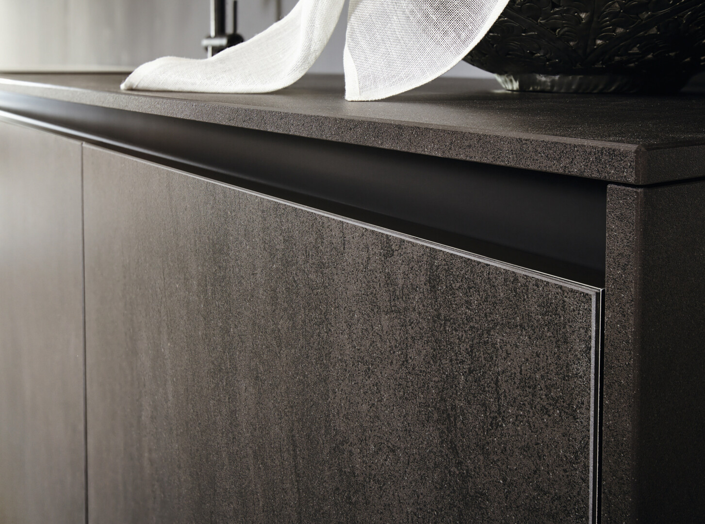 The next125 ceramic front NX 950 is supported by a frame structure with a high-quality finish. A solid aluminium edge surrounds the panel on all four sides thereby offering flush protection for the narrow ceramic sides. The durability and hardness of ceramic make the front suitable as a work surface. When used with the associated side walls, this makes it possible to create reduced, homogeneous kitchens.