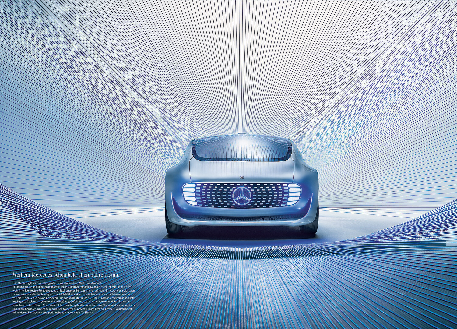 For the ad campaign of the Mercedes-Benz F 015, artist Sarah Illenberger was commissioned to produce five installations. Her creative task was to translate the features of the self-driving research car into an expressive pictorial world. To do this, she had to work between the poles of technological future and art-istic handiwork. The subjects take a leap into the new era of autonomous driving, rendering the associated changes touchable and comprehensible. Every installation is real, completely without using CGI – just like the car itself.