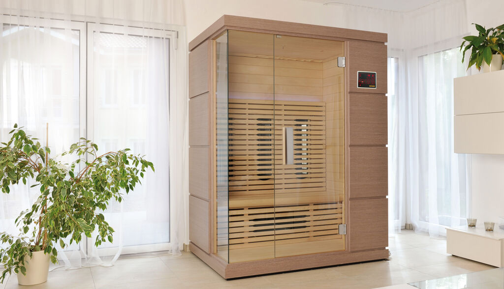 Selected noble woods characterise the modern design of the novus infrared cabin. The clear glass front gives the cabin its airy appearance, suffused with light. The harmonious interior offers perfect comfort while the cutting-edge control system can be managed both from in- and outside. An integrated LED panel produces balanced white light. Atmospheric LED colour lighting is available for a surcharge.