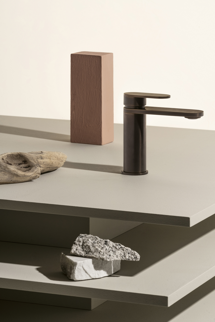 The single-lever mixers in the Octo collection are characterised by their gently curved lines and harmonious proportions. The flat spout, which ensures an even stream of water, is made entirely of high-quality, durable brass. The user can choose from a variety of different finishes, including chrome, polished and brushed nickel or gold, metal black and matt black, brushed British gold, copper and chocolate PVD.