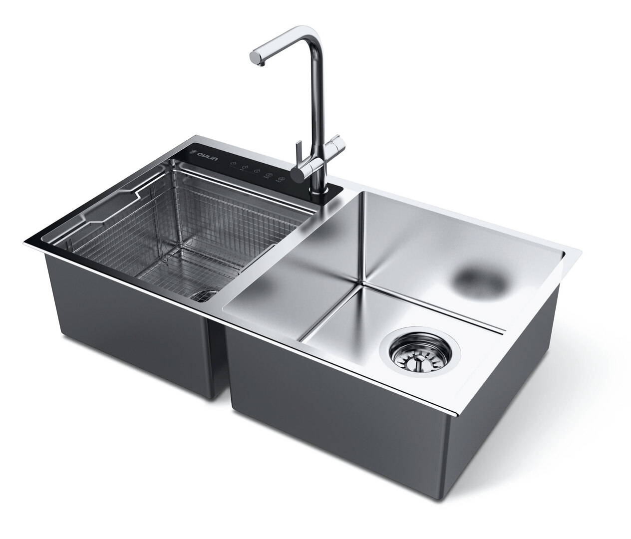 This sink was designed especially with the efficient cleaning of fruit and vegetables in mind. The large bowl serves the purpose of washing off rough, visible dirt. In the smaller bowl, pesticides, bacteria, viruses and chemical residues in fruit are removed almost completely by means of integrated plasma technology. The purist design of the double sink with its uncomplicated touch-operated user interface emphasises the cleaning function from a visual aspect.
