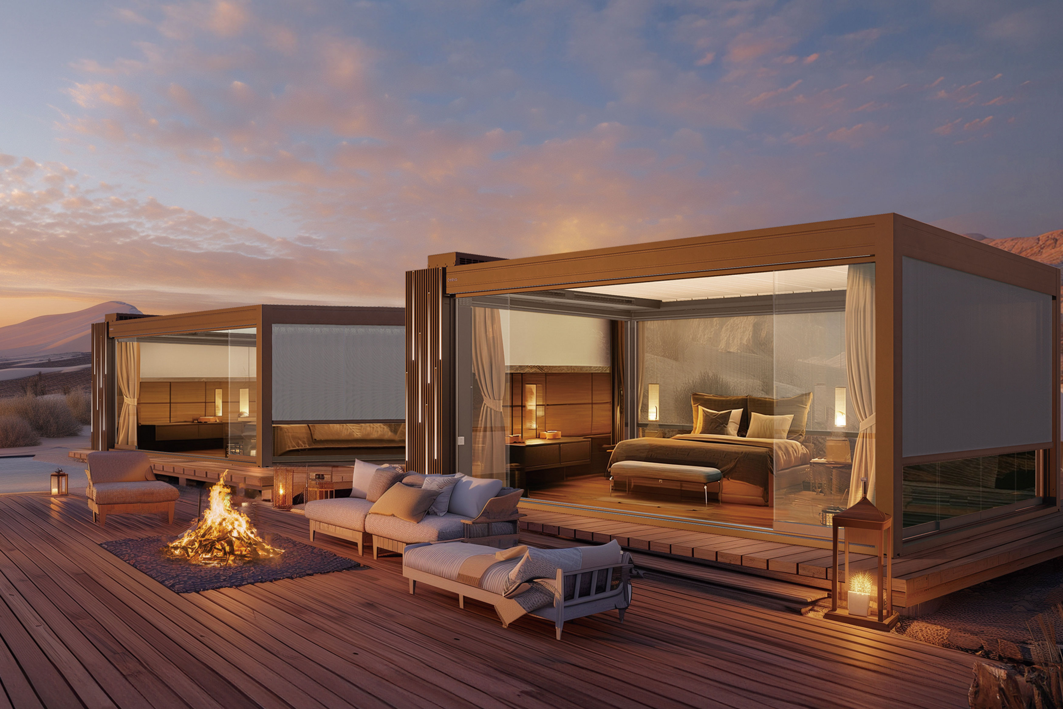 OMBRA is a sustainable louvre that blends technology and aesthetics into an all-weather smart awning system. It offers a modular, comfortable space for living, working, and leisure. The solar louvres and high-efficiency energy storage generate 15 kWh daily, addressing energy supply issues. Advanced features like a 120° automatic flipping louvre roof and climate control ensure comfort in various weather conditions.