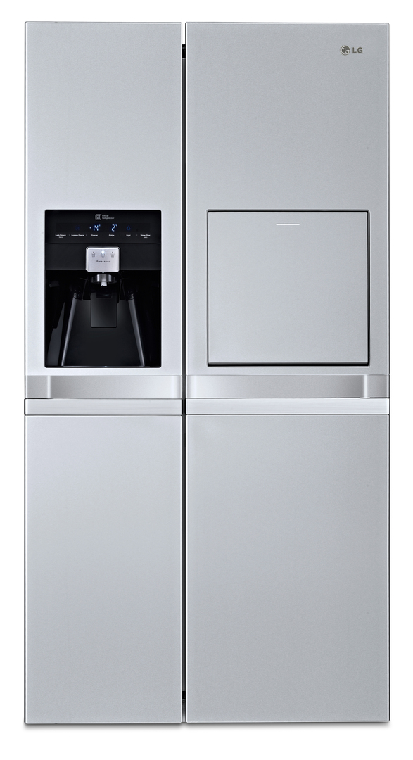 The reduced front design of this side-by-side refrigerator was achieved since the integrated bar is flush-mounted externally in the front and the handles are in pocket form. The ice and water dispenser is designed completely in black in order to minimise the dividing lines between the areas. The shape of the water/ice selection button is contrastingly emphasised and thus becomes a distinctive design element.