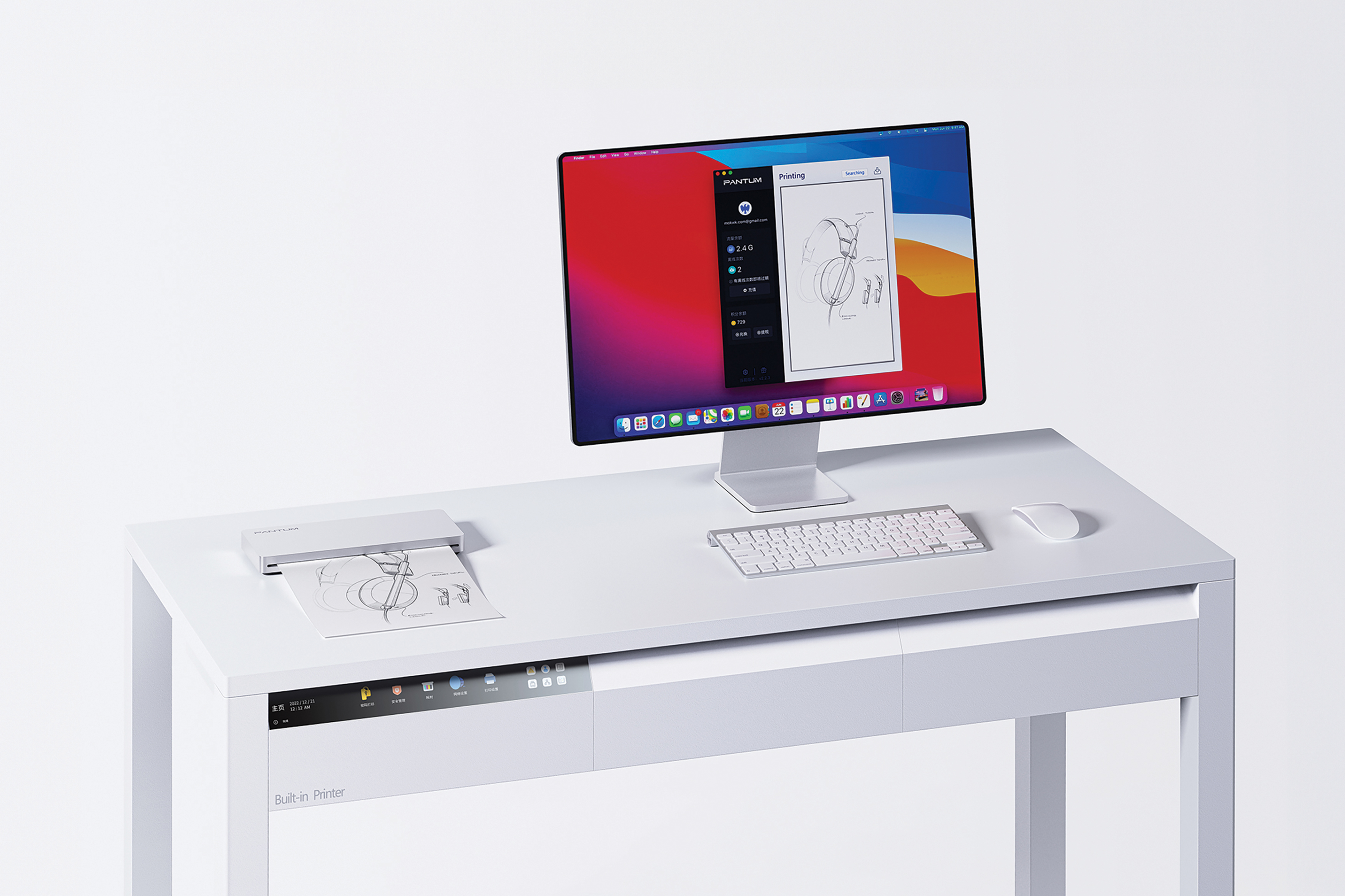 This innovative design integrates the printer body with the desk drawer, retaining only the paper output on the desktop. The ultra-thin, minimalist paper dispenser can be held with one hand and boasts a quality aluminium alloy finish. The main printer body, embedded under the desktop, combines with the drawer and features a touchscreen on the slope for easy operation.