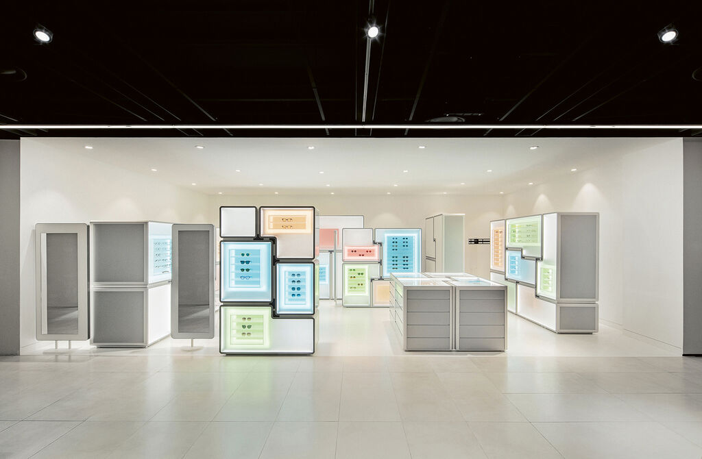 Located in the Gwanggyo Galleria in Suwon, South Korea, this brand store for Papyrus, an optician and retailer of luxury eyewear, aims to address a predominantly female target group. Soft colours and matt acrylic surfaces were used to create an elegant and airy ambience. All functional areas – from eye examination to the assembly and storage of the glasses – are part of the store which has neither walls nor doors. The open layout is a reference to local history as it is inspired by the traditional stone-building method used for Hwaseong fortress, a Unesco World Heritage Site in the region.