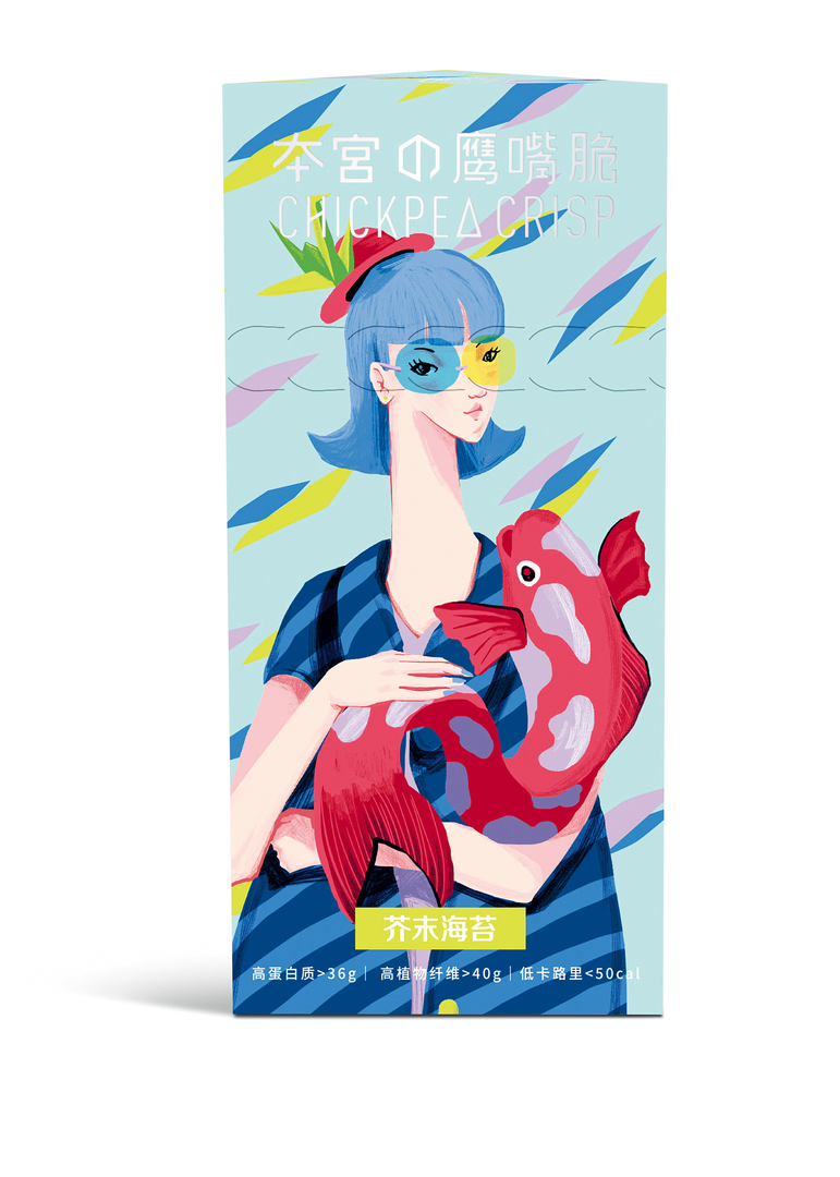The packaging design for the new product Pavomea Chickpea Crisp picks up on the aesthetics of portrait painting by Leonardo da Vinci. His portrait called “A Young Woman with a Silver Rat” served as direct inspiration in creating four female figures reflecting the four different flavours of the product. These figures also represent four different ideal types of women. As a surprise effect, the eye part of these illustrated figures clearly changes when the packages are torn open.