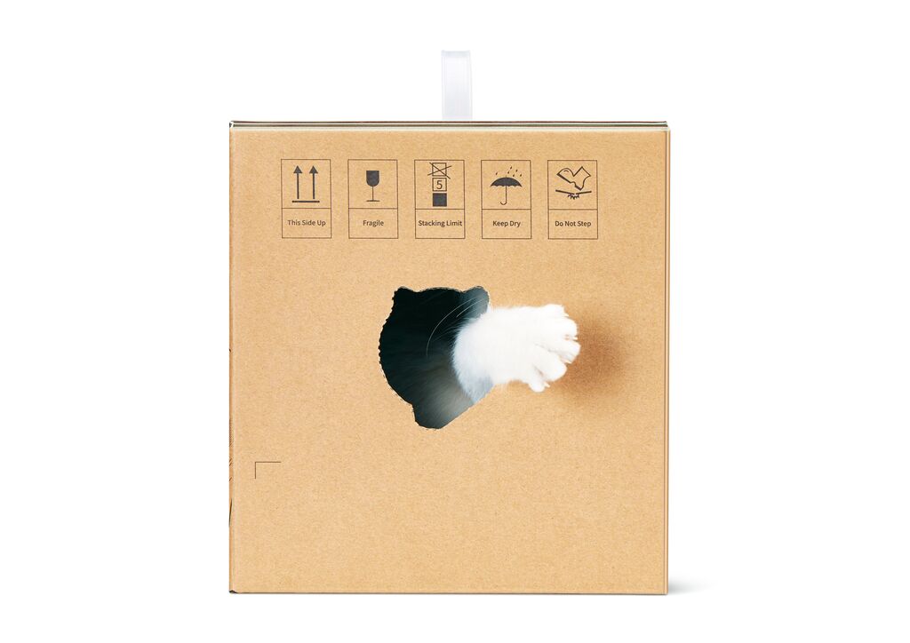 Pawbby combines environmentally friendly, recyclable packaging with sufficient product protection by using recycled cardboard, which can be reused in many different ways once the product has been unpacked. The box comes with prepunched perforations that allow it to be transformed into a cat house, for example. The remaining sections, which bear the silhouette of a cat head, can be used as coasters and thus act as long-term reminders of the brand with consumers.
