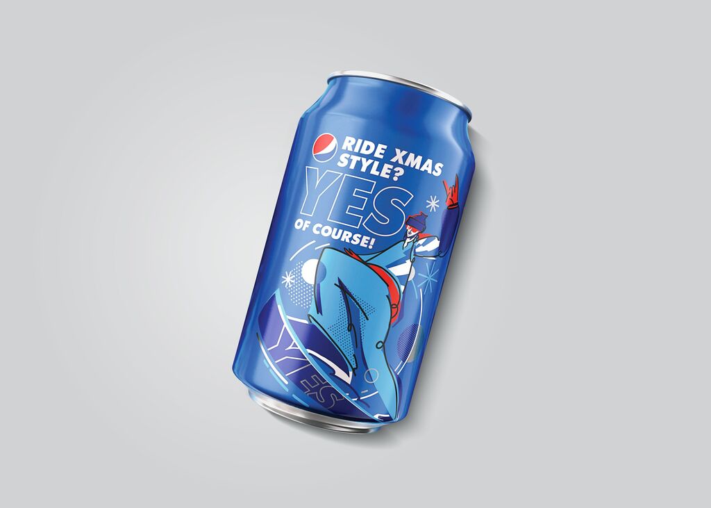 Pepsi New Year 2021 limited time offer was developed as part of a larger Pepsi campaign to celebrate the 2020–2021 holiday season in Eastern Europe. The concept focused on a “Yes, of course!” sentiment, embracing unexpected and memorable winter holiday adventures. Exciting moments are captured with a series of limited-edition interactive cans to engage consumers, aiming for higher brand activation. In a bold artistic style inspired by pop art and set against a backdrop of Pepsi blue, each can features an invitation to join in a snowy sport or festive activity. This design approach was created to be flexible and easily transferable to other formats and languages.