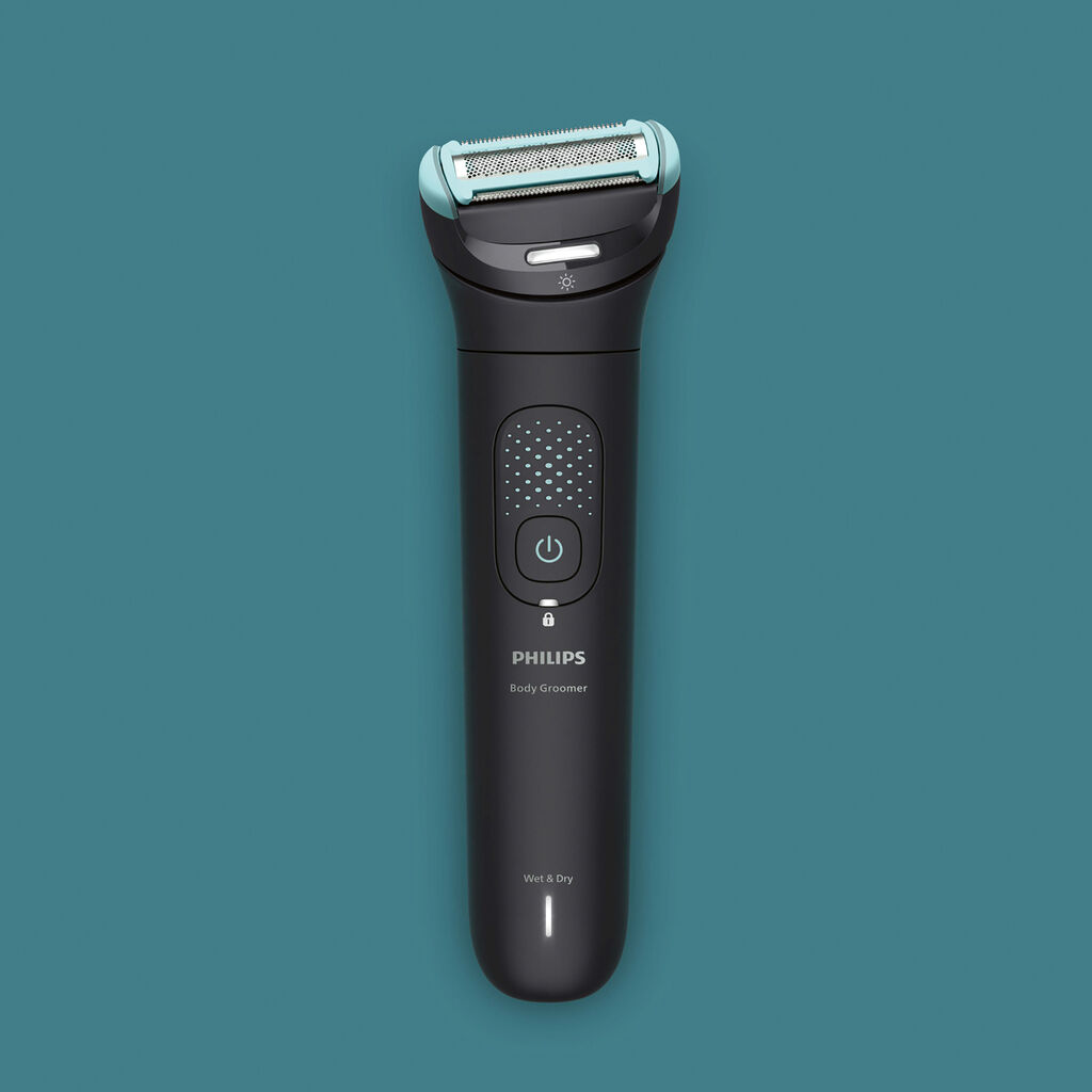 The products in the new Philips Body Groomer Series 3000, 5000 and 7000 are equipped with several interchangeable accessories for gentle trimming of body hair. A sleek design ensures precise personal grooming. The waterproof housing provides flexibility, while an integrated light feature enhances visibility – even in difficult-to-access areas. A special accessory extends the handle to simplify the process of trimming back hair. Bright colour details on the body and blade are another charming feature.