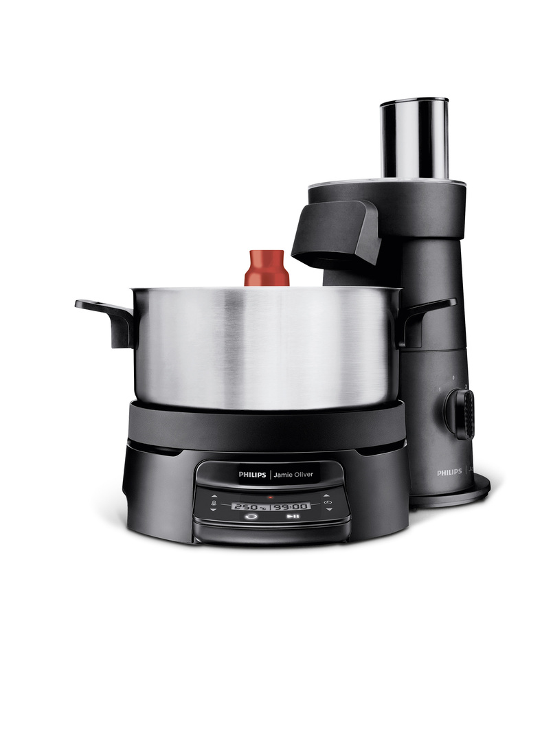 The HomeCooker is the first of a series of kitchen appliances co-created with British chef Jamie Oliver. The kitchen appliance can chop and grate ingredients as well as stir, steam and sauté, then be left cooking unattended. Thanks to the specially developed AutoStir technology, the food will not burn while cooking. The system is flexible and modular, easy to disassemble and dishwasher safe.