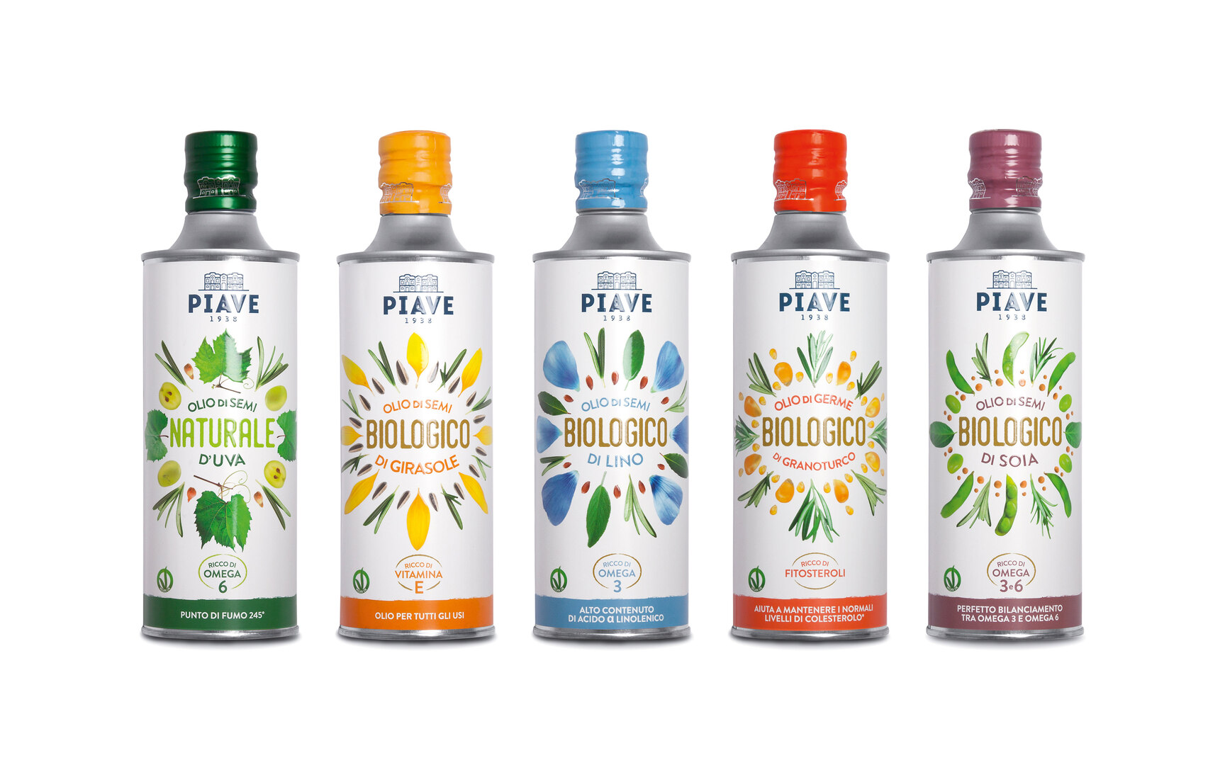 Piave Organic is a line of organic and natural seed oils, created for a rapidly evolving market. The challenge was to create a packaging design able to stand out among the competition, while also communicating the natural essences of the oils on a supermarket shelf. The key visual translates the power of nature into a positive and vibrant image, reminiscent of the splendour of a flower’s corolla. Each of the garlands surrounding the name of the product is composed of the characteristic parts of the plant from which the oils are produced and enriched.