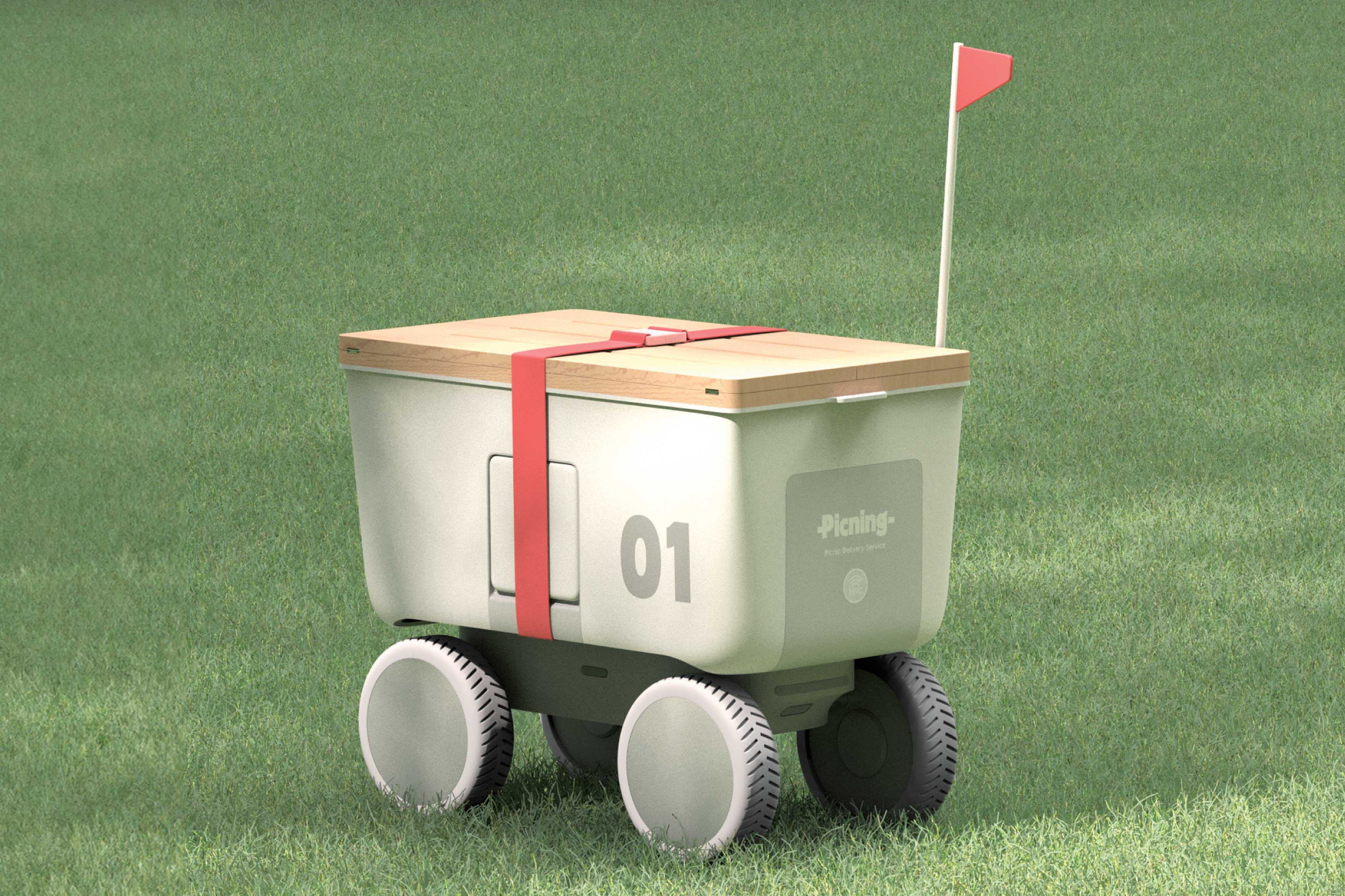 Picning provides a seamless picnic experience by delivering essentials and food. Verify identity with NFC tagging when making an order, enjoy the picnic, and return items easily. The Eccentric Wheel ensures stable delivery, maintaining balance even on slopes, and is height-adjustable to a low table. The device charges automatically at dispatch or pickup. Simply unfold Picning for a spontaneous picnic space. Red Dot Award: Design Concept | Red Dot: Next Gen Award | Concept | Outdoor and Camping Equipment