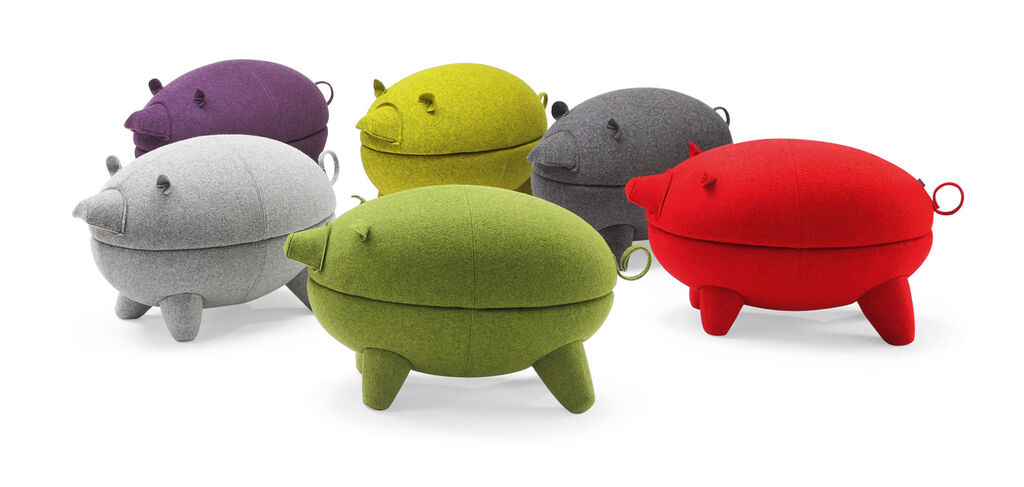 Pig is a zoomorphic pouffe that can be used in a wide range of situations, displaying a simple yet elegant shape coated in either leather or fabric. By lifting the upper half, it becomes a small tea table with an ellipsoidal Plexiglas panel under which little objects and magazines can also be placed.