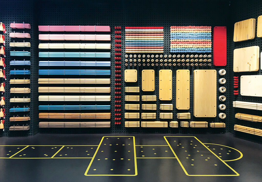 The concept for the PIY Jinsha Store was to create “a furniture store without furniture”. All furniture parts are hanging on walls, inviting customers to assemble them hands on for testing on the spot or to put them together virtually on a touchscreen. The wall surface features punched plates that are equipped with special hooks for holding the parts. This allows for easy adjustment when new shelves are needed or new products are on the market. The floor is paved with PVC cushions to prevent injuries. In addition to yellow tartan patterns correlating with the furniture footprints, there are also yellow spots that cor-respond to the different furniture “footholds”. Together they guide customers through the assembly quickly.
