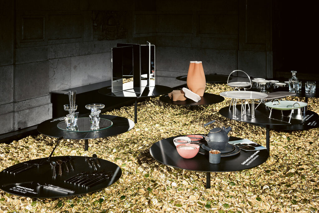 The Austrian national showcase of selected design products from Austria, presented at Milan Design Week 2019, was held in the Sala Reale, the former royal family’s waiting room at the central railway station. The idea was to divide the event into two spaces, each with its own theme. The first was a dark monumental space like a treasure chamber that housed a selection of design objects majestically enthroned above a pool of golden chocolate coins. The other space was flooded with natural light and filled with white packaging material on which the exhibits seemed to float, inviting visitors to become children again by focusing on the joy evoked by the objects.