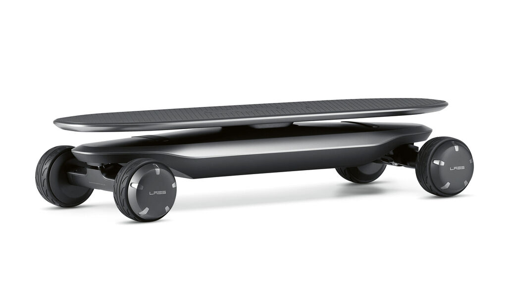 The electric skateboard impresses with its compact design as well as the innovative inclinometer, which ensures safety and controls the centre of gravity, not only during fast rides.