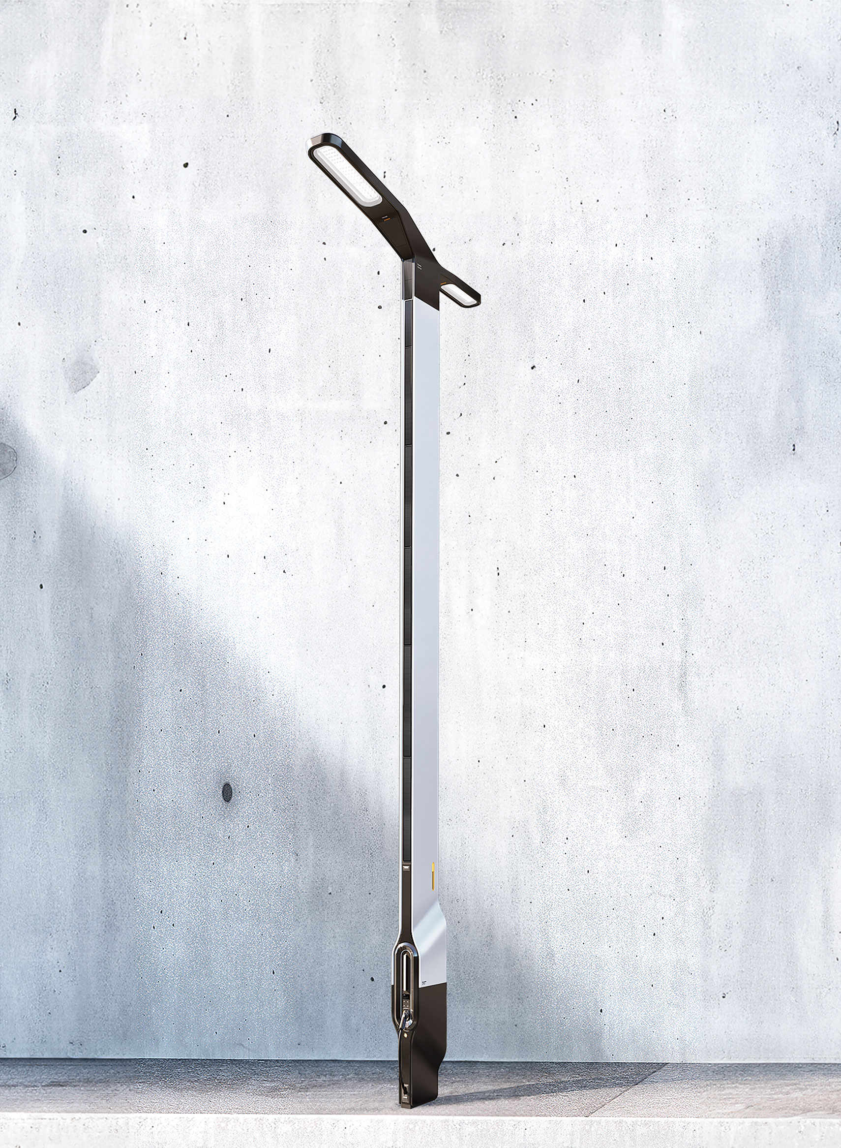 POLARIS TYPE T addresses the increasing demand for electric vehicle (EV) charging in urban areas, where existing infrastructure is often insufficient and limited to specific zones. Expanding dedicated charging stations is challenging due to urban land constraints and grid strain. By integrating charging systems into the extensive and densely distributed public lighting network, POLARIS extends charging coverage, boosts efficiency, and reduces the need for dedicated space. Solar-powered integration further alleviates grid load and supports charging various electric vehicles, including bicycles. POLARIS TYPE T also features public media advertising displays, offering a sustainable business model through paid public ads that fund product maintenance and updates. The system’s solar panels power its lighting and electric transportation functions, while a user-friendly interface and retractable cable reels provide a convenient charging experience. The design of POLARIS is clean and ingenious, thoughtfully separating the charging, lighting, bike parking, and electronic display areas. Dynamic trapezoidal metal casings integrate the front runway-shaped charging zone, rear bike parking barrier, and electronic display screen. The sloping Z-shaped dual-directional lighting section illuminates roads and sidewalks while aiding solar energy collection. Constructed from recyclable alloys, POLARIS guarantees durability and ease of maintenance through its modular design. Red Dot Award: Design Concept | Concept | Vehicle Accessories