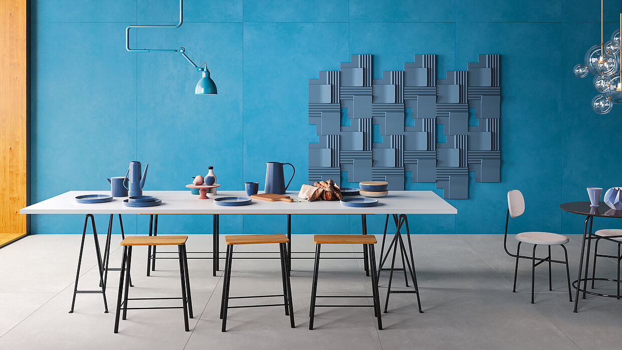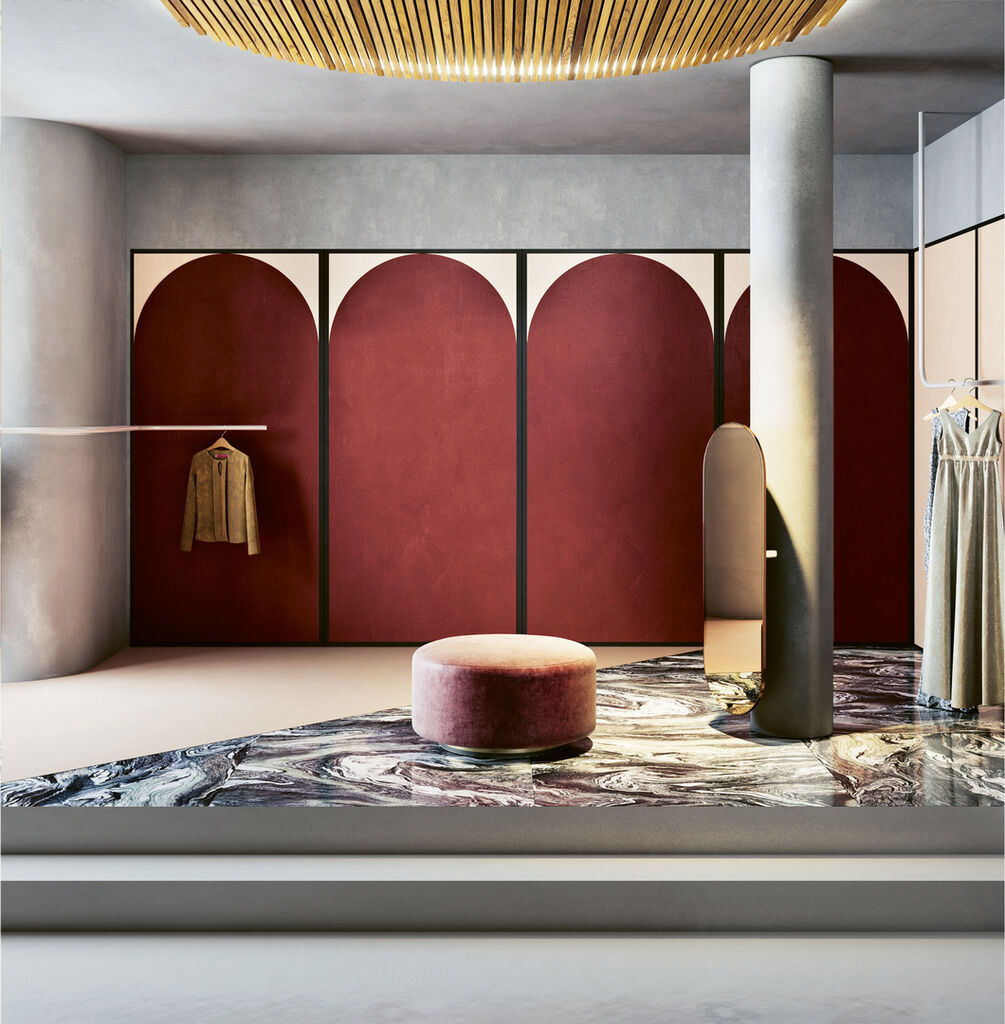 Policroma offers an aesthetic formula that incorporates the stylistic canons of classicism and an expressive code of modernism. The collection’s repertoire of large slabs features motifs that are inspired by the vein texture of rare rocks and the sophisticated colours of Marmorino plaster and refer to two materials that are central to the Italian building culture: marble and marble-like surfaces. The Policroma collection revives them, transforming them into exquisite design elements on ceramic surfaces.